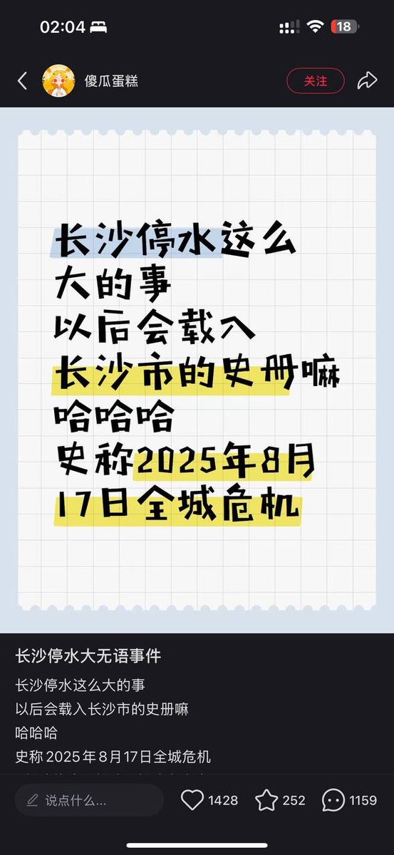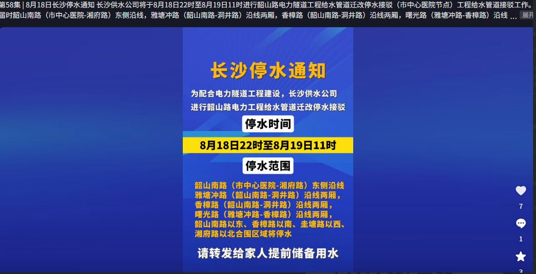 后续:8月17日,长沙停水。8月18日,再次宣布自2025年8月18日22时至8月19日11时停水。