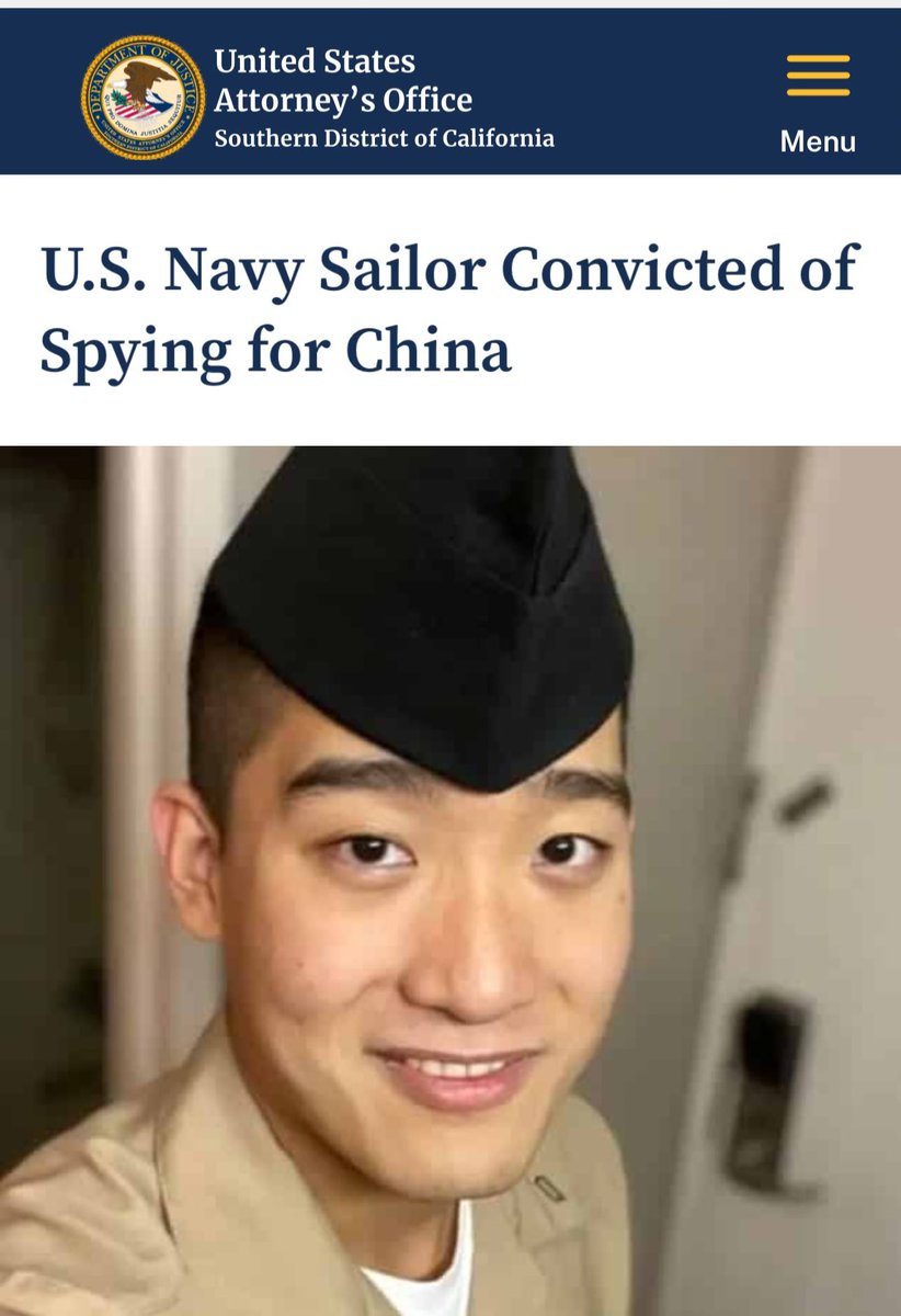Jinchao Wei, 25, a US Navy sailor in California, was convicted of spying for China. His charges includes espionage, conspiracy to commit espionage, and unlawful export of classified data about US Navy ships.What is worse, in his text, he jeered at other Navy sailors "make extra