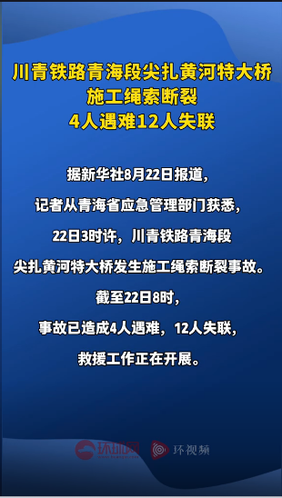 8月22日,据新华社消息:川青铁路在建的尖扎黄河特大桥22日3时施工绳索断裂,事故救援进行中,截至8时有4人遇难、12人失联。
