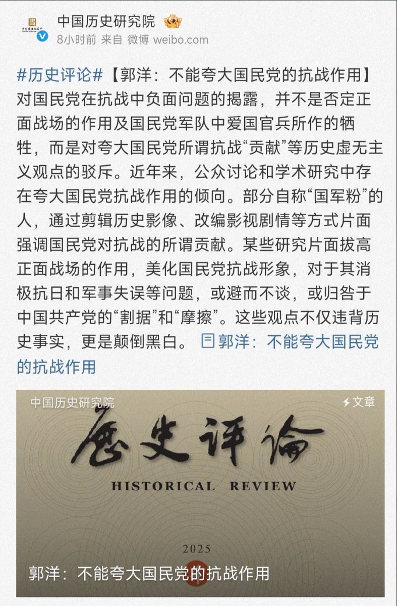 8月22日,中国历史研究院发文:不能夸大国民党的抗战作用。