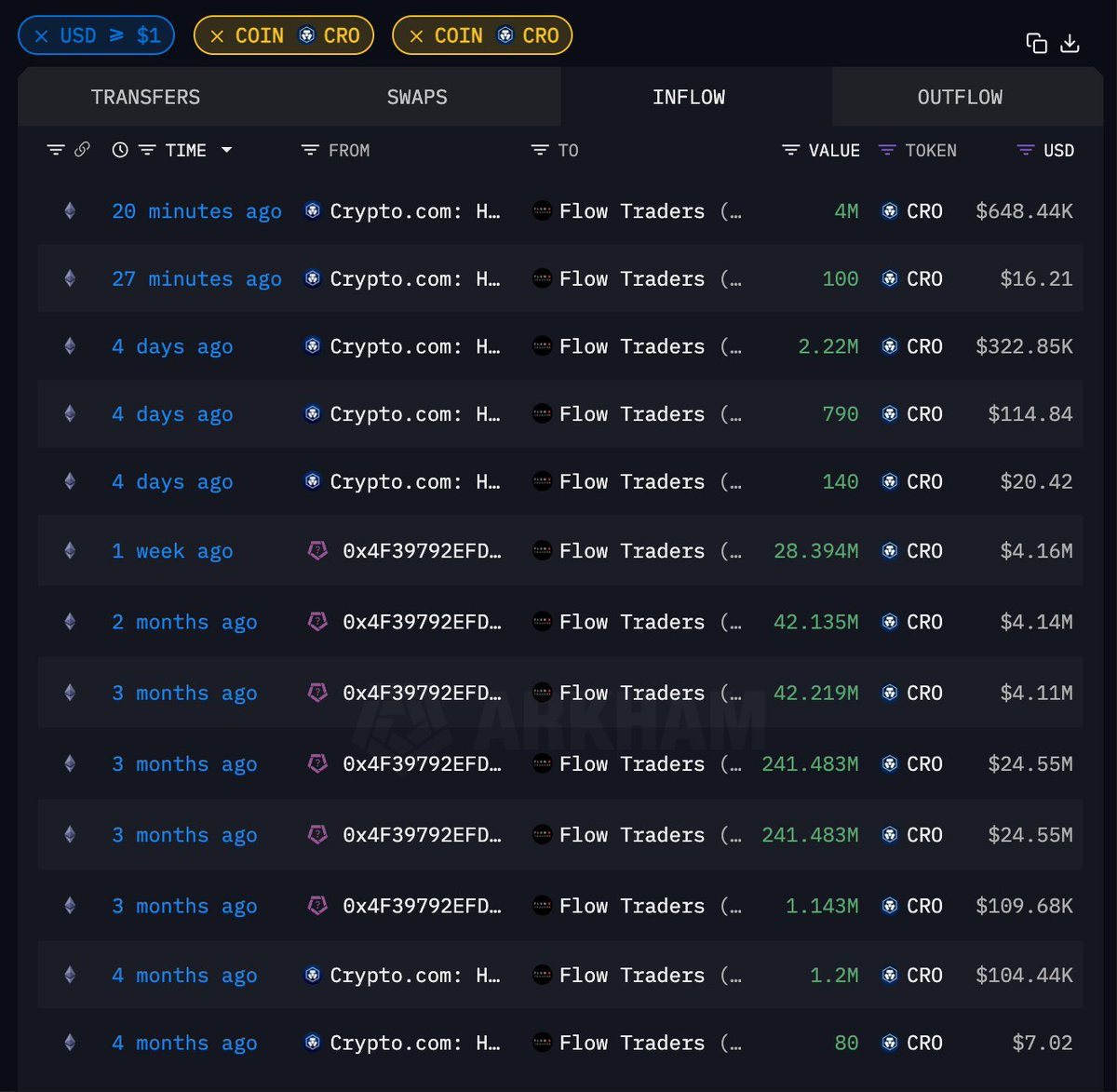 Flow Traders 疑似为 $CRO 做市商 /金融服务商过去 4 个月累计从 提出 6.07 亿枚 CRO,价值 6047 万美元,平均提出价格 $0.0996,目前 98.8% 的代币已转移至 BitGo 相关合约地址钱包地址