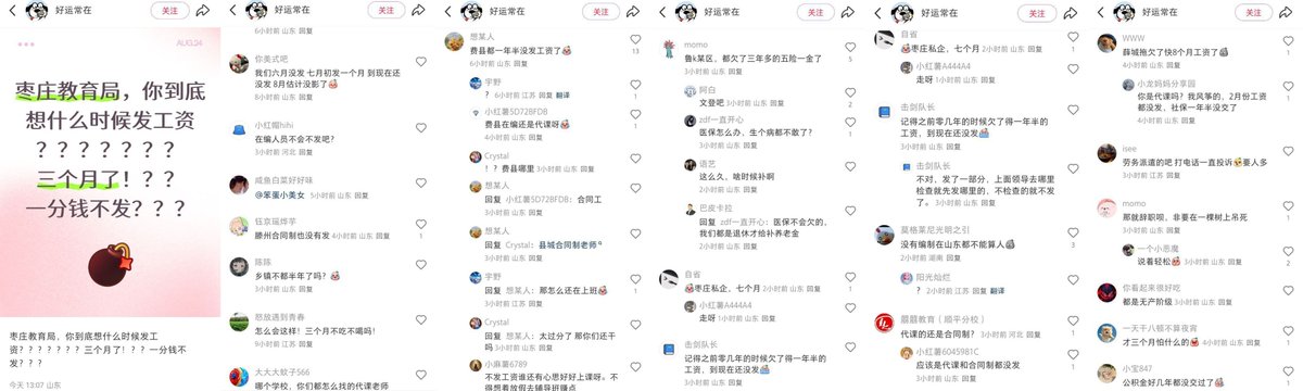 8月23日,山东枣庄,有网友发帖称教育局已拖欠薪资三个月。评论区大量留言反映各地类似情况:费县合同制教师被欠薪一年半,威海教师三年多未缴五险一金,滕州合同制教师同样未收到工资,部分乡镇甚至普遍被拖欠半年以上。