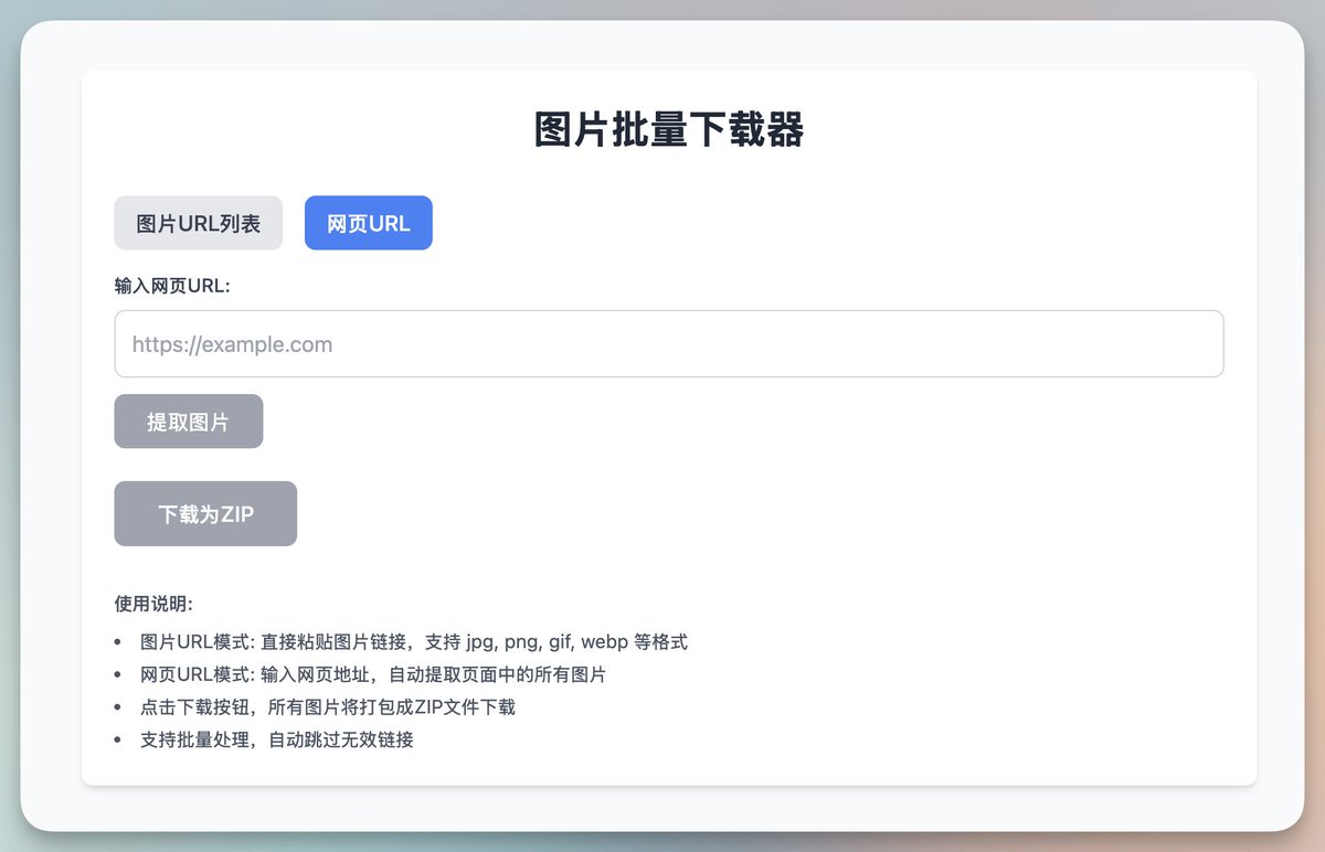 AI编程方便之处,需要什么小工具。CC 几分钟开发一个,Vercel直接部署使用。比如,输入网址,自动下载页面所有图片为 zip文件。访问地址: