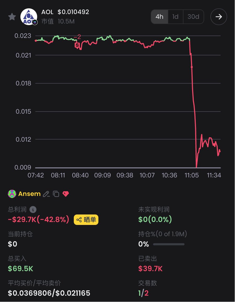Ansem(@blknoiz06) 在 WLFI 发布公告前及时清仓割肉 $AOL ,最终亏损 2.97 万美元🤔