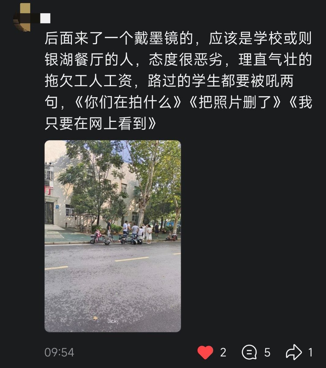 网友投稿:9月1日,武汉轻工大学金银湖校区东方龙餐厅因拖欠商户工资,商户拉起横幅维权。