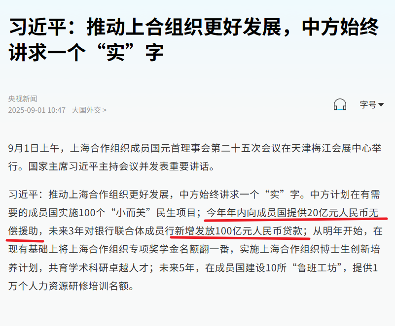 9月1日,习近平再次宣布大撒币:将于今年年内向上合组织成员国提供20亿元人民币无偿援助未来3年对银行联合体成员行新增发放100亿元人民币贷款从明年开始,在现有基础上将上海合作组织专项奖学金名额翻一番未来5年,在成员国建设10所“鲁班工坊”,提供1万个人力资源研修培训名额。