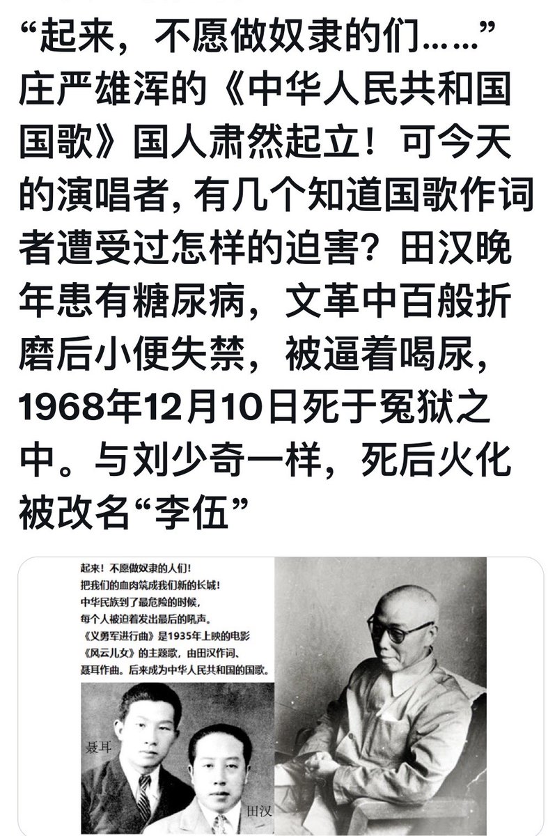 《义勇军进行曲》,与《游击队歌》一样,是又一首脍炙人口的抗战歌曲,后来甚至成为《代国歌》和《国歌》。然而其歌词作者却被自诩的“抗战中流砥柱”迫害至死。