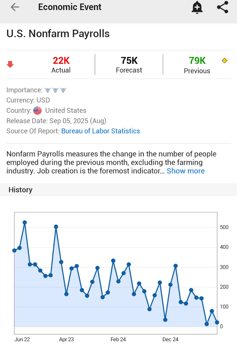 ⚠️BREAKING:*U.S. AUGUST NONFARM PAYROLLS RISE BY 22,000; EST. 75,000; PREV. 79,000🇺🇸🇺🇸