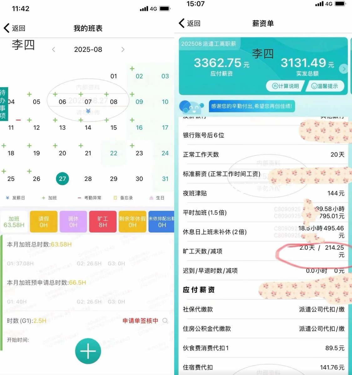 网友投稿成都,有学生在富士康打暑假工遇到工资无故被扣的情况。他加班34小时,工资单却只算28.5小时,损失一百多元。同去的朋友“张三”“李四”也被多扣一天双倍工资,其中“李四”甚至被额外记旷工一天。联系线长后,对方推诿称是“没注意离职手续”或“派遣公司问题”。