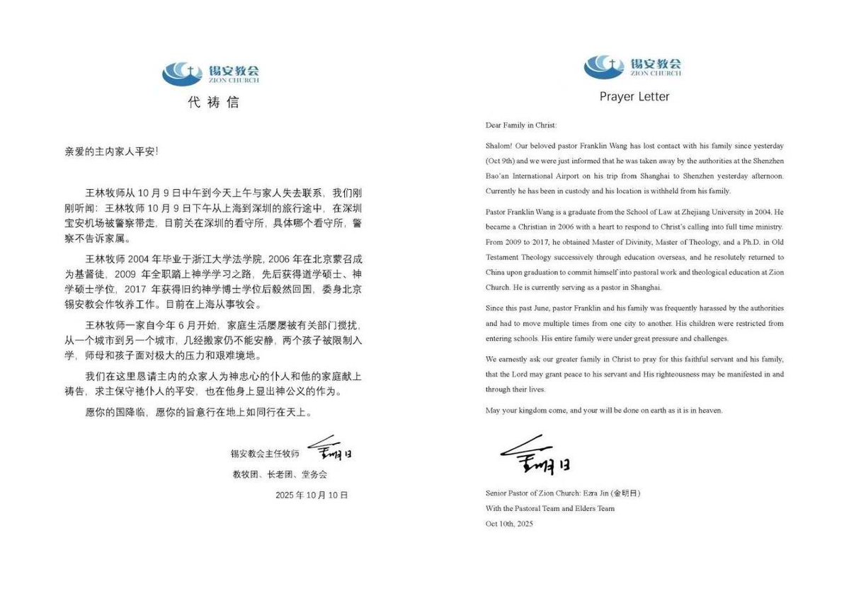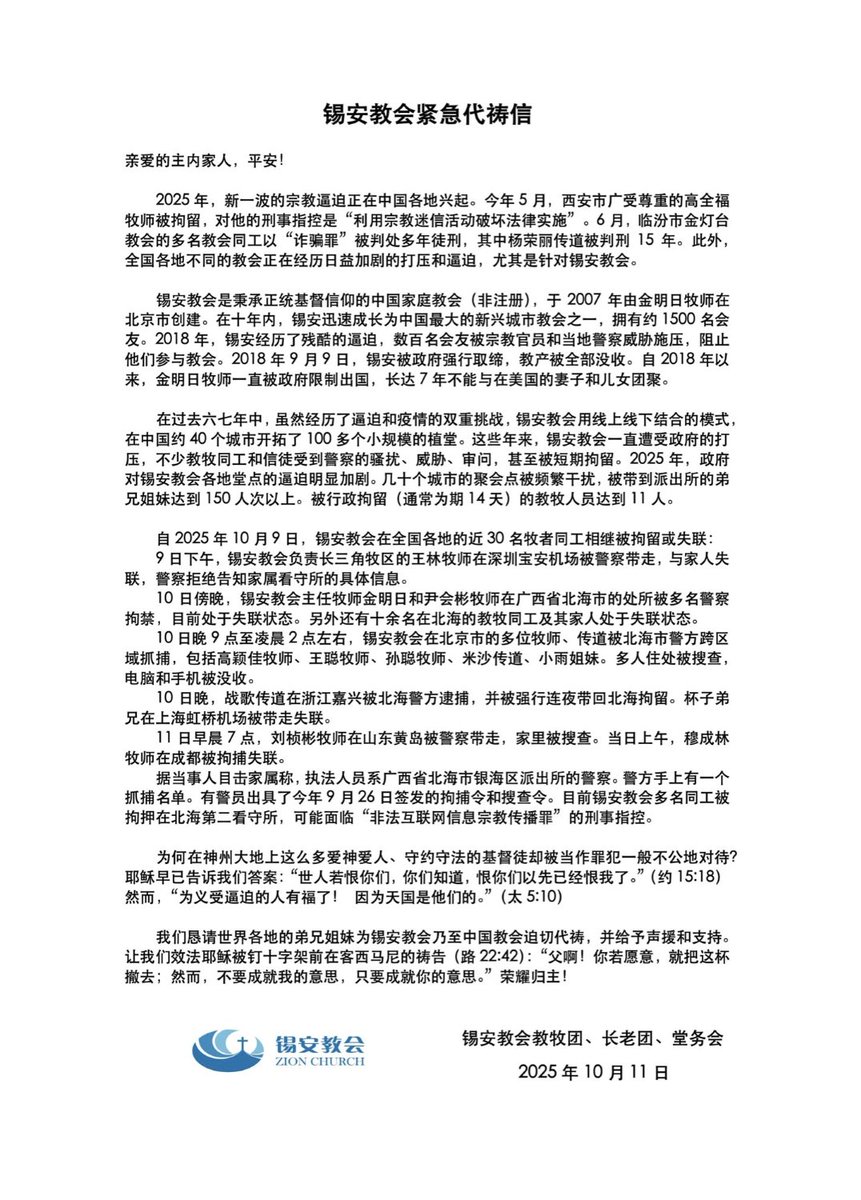 中国开启家庭教会大抓捕10月9日,锡安教会王林牧师被警察恶意逮捕。10 日起,多个城市的锡安教会牧者和信徒遭到中国当局突袭,数人被带走或失联,该教会长期处于中国宗教自由的边缘,而此次行动可能标志着针对该教会的更广泛打压。截至目前(北京时间