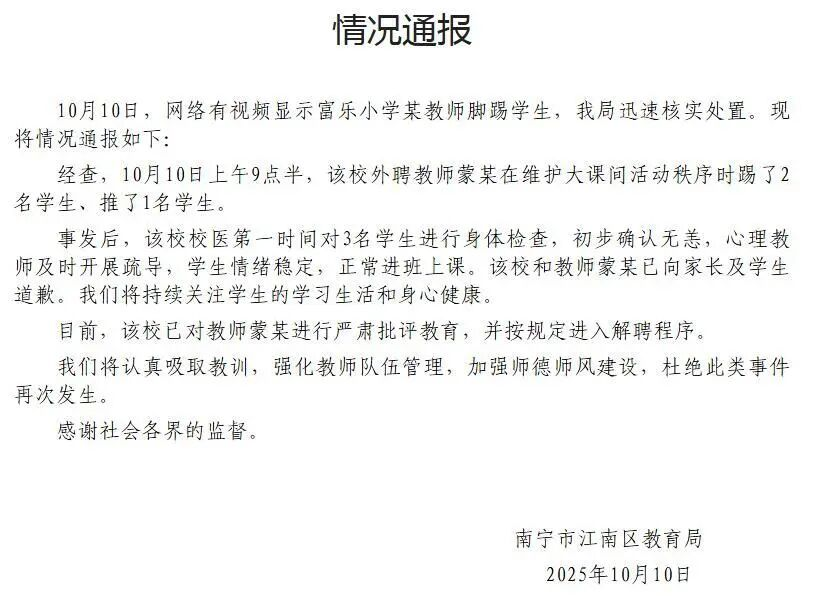 后续:10月10日晚,南宁市江南区教育局发布情况通报:目前,该校已对教师蒙某进行严肃批评教育,并按规定进入解聘程序。