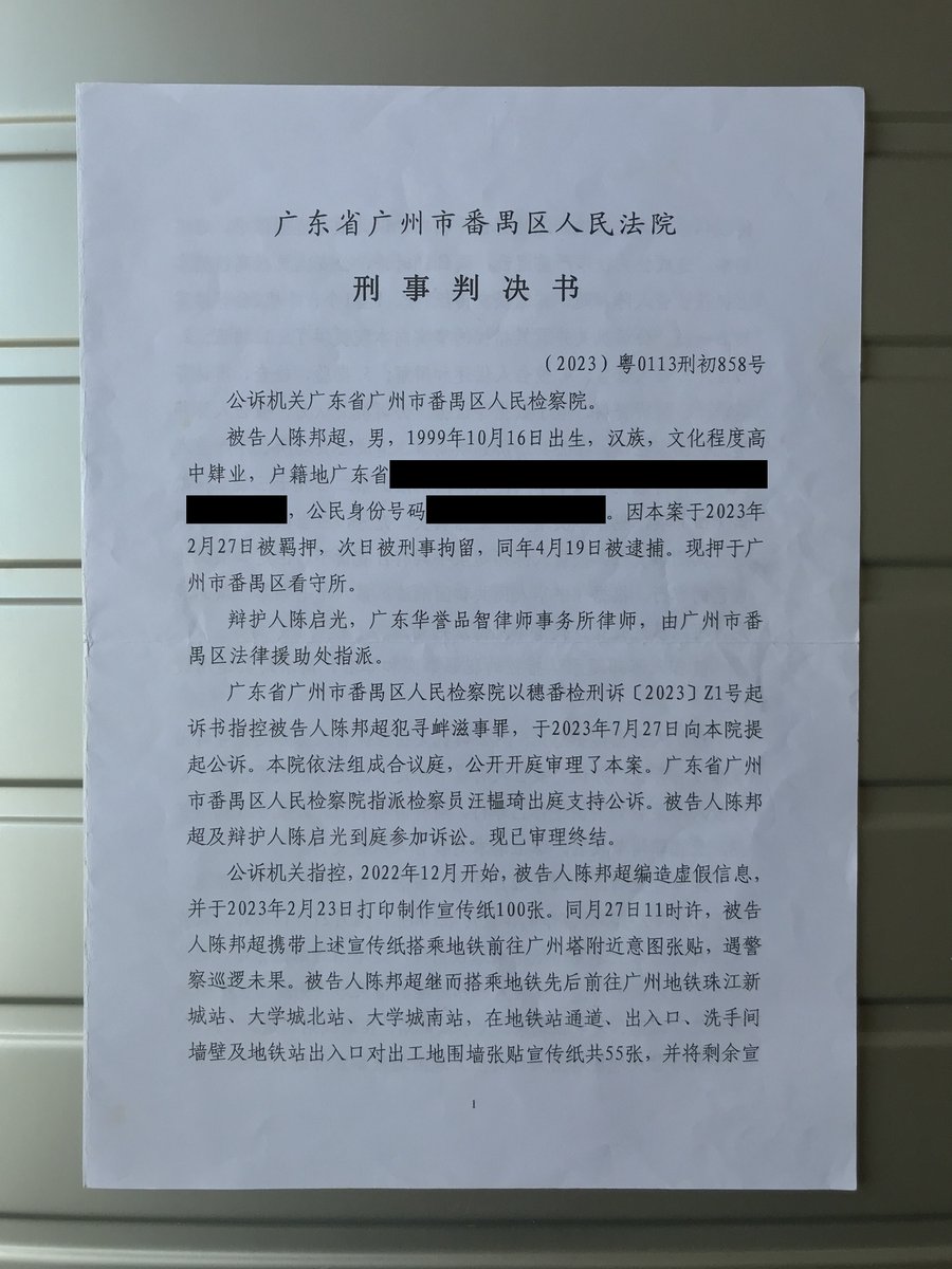 2023年7月27日,广州市番禺区检察院以“寻衅滋事罪”起诉陈邦超。审判在看守所旁的密闭法庭内进行。开庭前几日,他才首次见到中共指派的律师——一名公开表态“拥护党领导”的辩护人。同年9月21日,法院判处他有期徒刑十八个月。