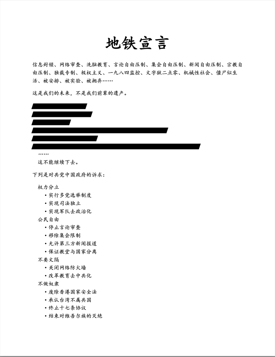 (注明:以下展示的《地铁宣言》版本为原始版本,张贴的海报经过改进后,只有一页。)