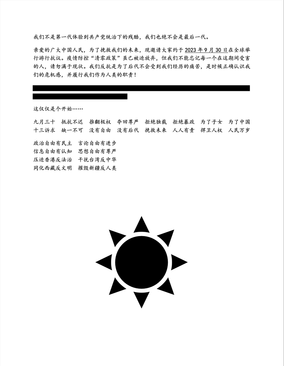 这份宣言语言犀利、结构清晰,最后以“抵抗不迟、推翻极权、夺回尊严”作为结语,延续了“白纸革命”的精神,却更直接地挑战了中国共产党的统治。
