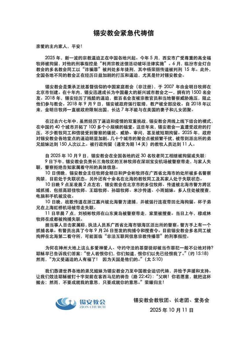 大逼迫的时代说来就来,当成都秋雨教会被彻底扫荡之后,北京锡安教会迟早也要步上秋雨的后尘。10月9日,锡安教会王林牧师被警察恶意逮捕。10 日起,多个城市的锡安教会牧者和信徒遭到突袭,数人被带走或失联,该教会在金牧的带领下,长期处于宗教自由的边缘,此次行动标志着对家庭教会的打压和逼迫进入常态。