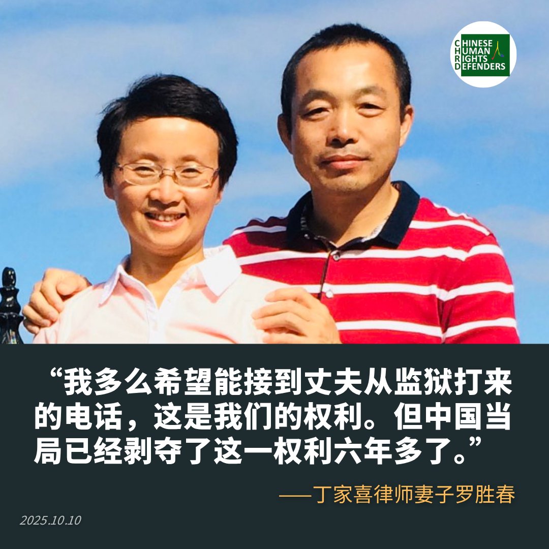 中国当局剥夺或限制了许多囚犯与家属通信的权利,包括禁止他们与境外家人通话、将囚犯关押在离家数千公里外的监狱,或派出国保人员威胁探视的家属。丁家喜律师妻子罗胜春:“我多么希望能接到丈夫从监狱打来的电话,这是我们的权利。但中国当局已经剥夺了这一权利六年多了。”