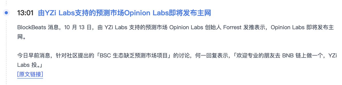 Perp DEX 卷完,开始卷预测市场了🤣今天一姐 一句「去 BNB 链上做一个,Yzi Labs 投」,评论区打卡的项目就排到了巴黎,毕竟 Aster 已经验证了「BSC + Yzi Labs + CZ」加持的能量,被 Yzi 投资就是走进 BSC 家谱的敲门砖看到已经有个机智的项目先声夺人发了公告,叫 Opinion