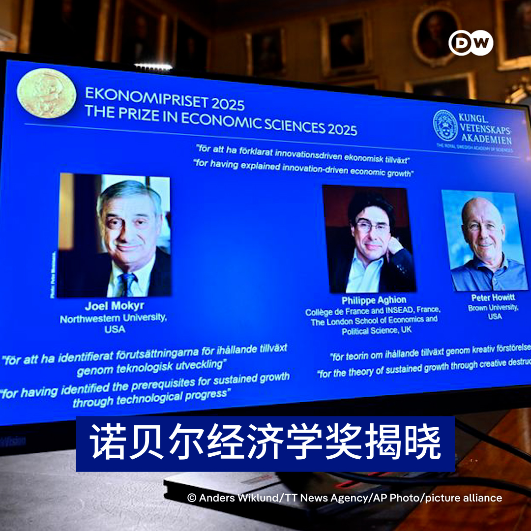 诺贝尔经济学奖周一(10月13日)揭晓,三名经济学家获奖,以表彰他们对创新驱动经济增长理论的阐释。三位经济学家分别为美国/以色列经济学家乔尔·莫基尔(Joel Mokyr),法国经济学家菲利普·阿吉翁(Philippe Aghion)和加拿大经济学家彼得·豪伊特(Peter Howitt)。