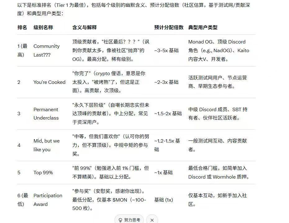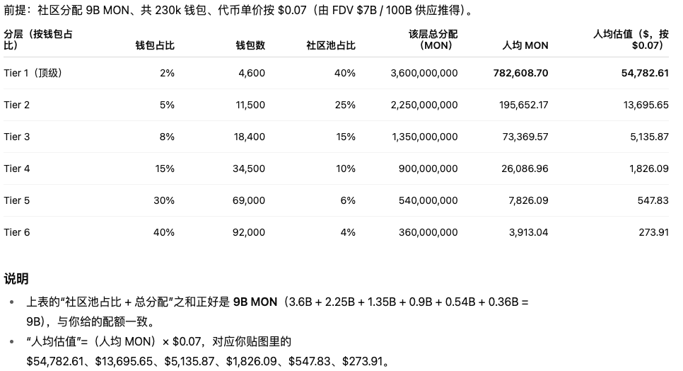 目前社区也有一个猜测的表格,我看了一眼至少是有逻辑的,虽然最终需要看 $MON 的估值才能准确,但给大家做个参考。