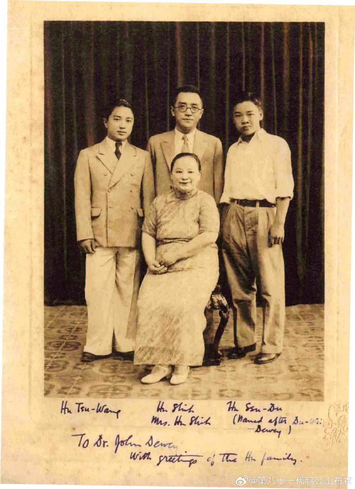 图:胡适将这帧“全家福”题赠给他的老师杜威博士,后排右一为胡思杜