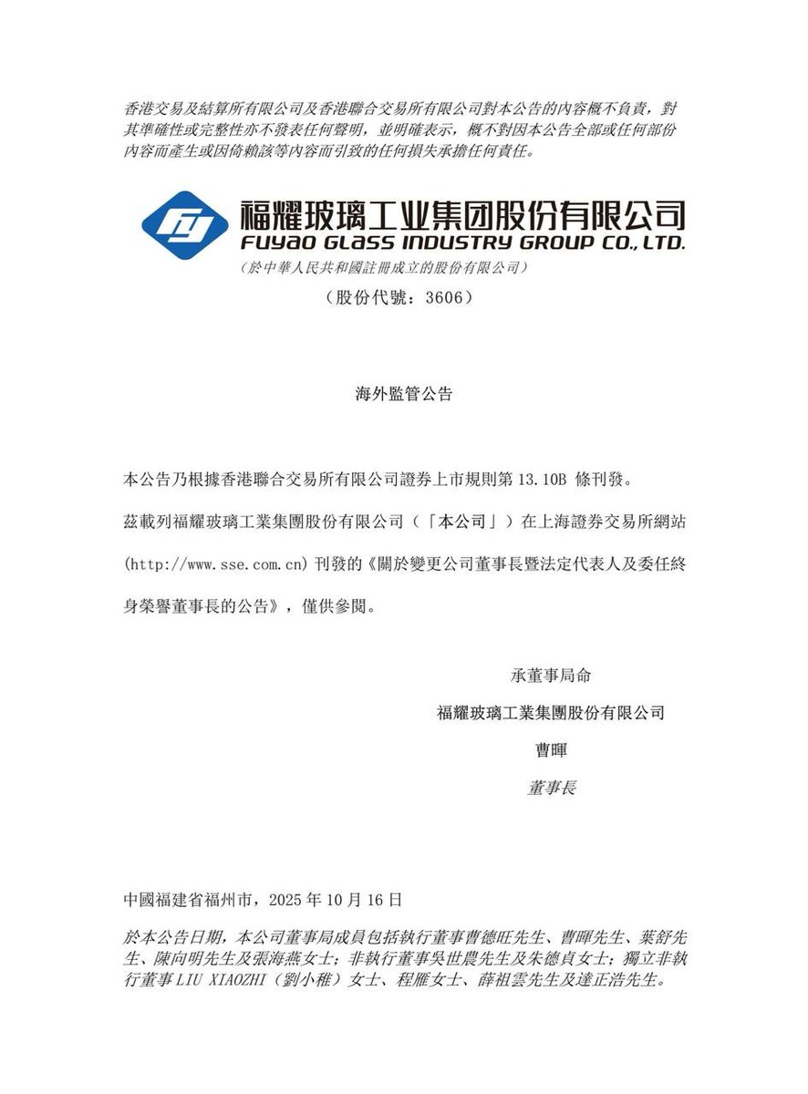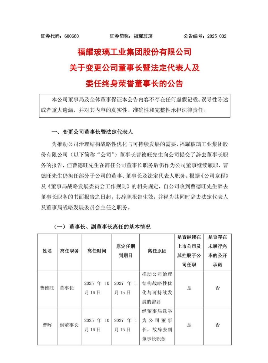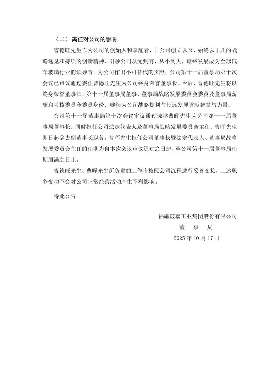 10月17日,曹德旺辞去福耀玻璃董事长职务,由其子曹晖接任董事长职务一职。