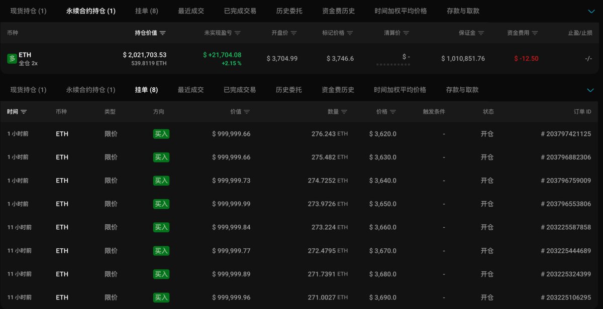 更新:朋友们,好像真给他抄到底了?🤪在 [$3660 - $3710] 挂单的地址成功接到了价值 200 万美元的货,开启 $ETH 2x 多单,目前持仓 539.81 ETH,开仓价 $3,704.99,浮盈 2.2 万美元在此基础上,他再一次调低了自己的限价单区间,在 [$3620 - $3690] 挂了 800 万美元传送门